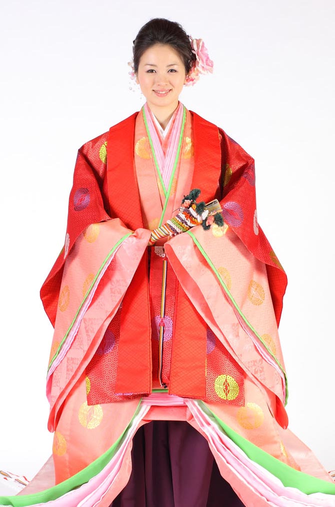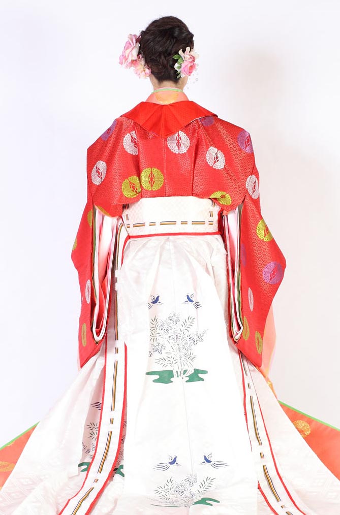 良き花嫁となるように祈りを込め、桃重ねを用いております。紅梅は、早春に、厳しい冬の寒さに耐えて花を咲かせるおめでたいお花。婚礼にふさわしい豪華で可愛い、人気No.1のお薦めの一着です。